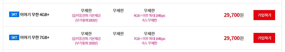 아래 이야기모바일 홈페이지의 요금표를 보면 LTE 무제한 요금제 7기가 기준으로 약 3만 원입니다.